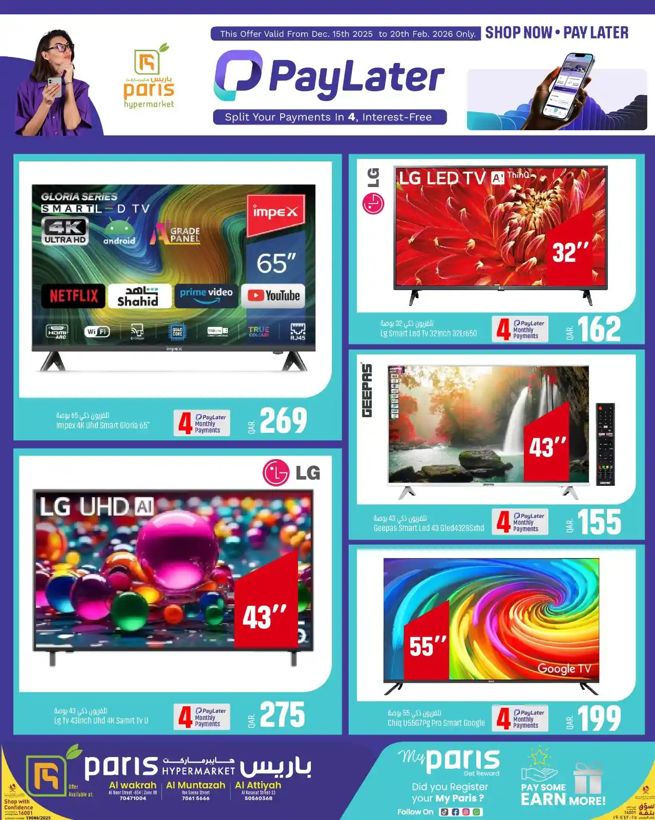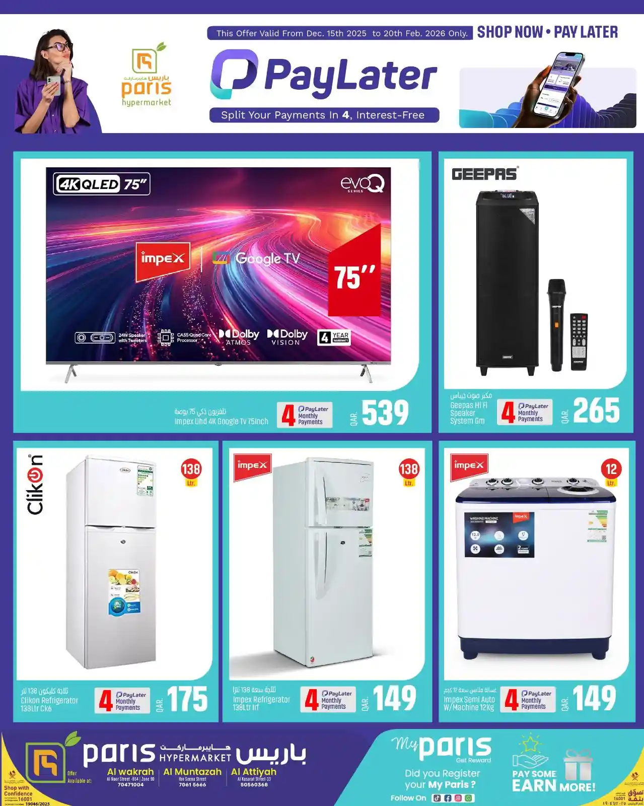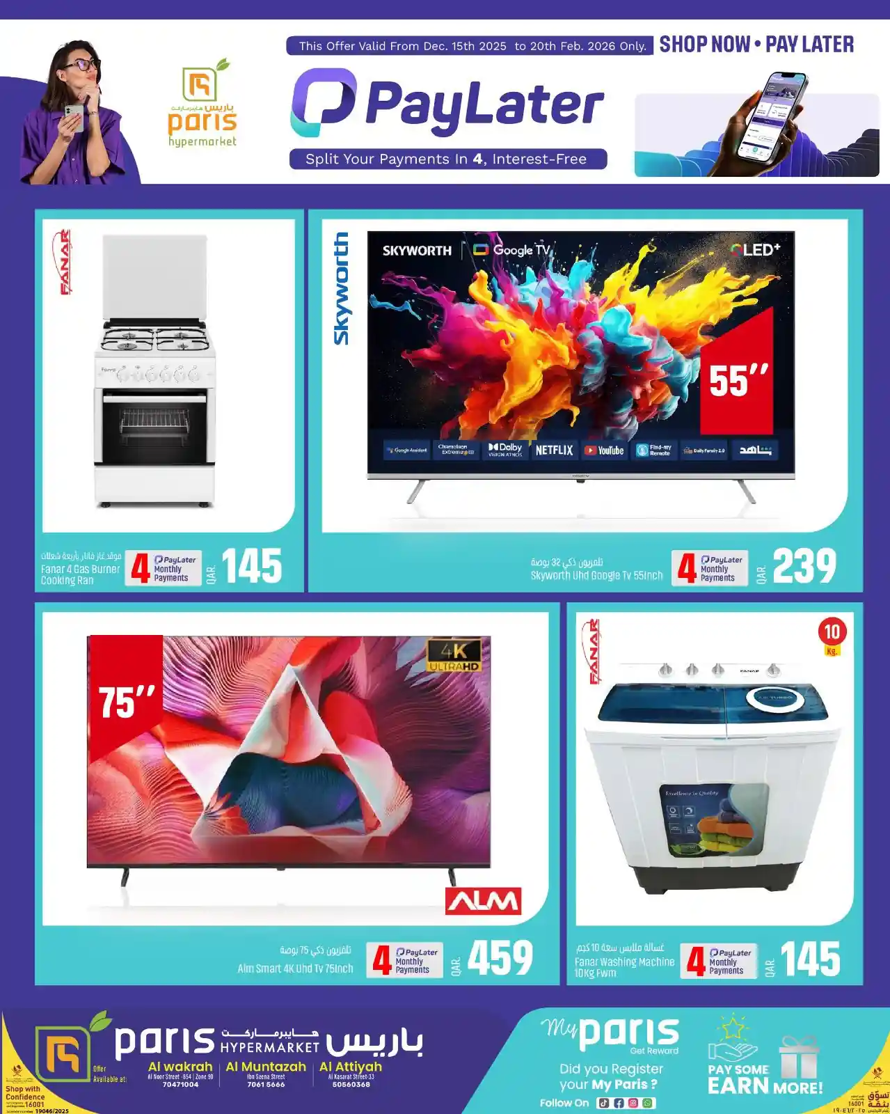 عروض نت تقدم لكم احدث عروض باريس هايبر قطر اليوم الجديدة فى صفحة واحدة اليوم 15 ديسمبر حتى 20 فبراير 2026 تقسيط الاليكترونيات العروض الاسبوعية من باريس هايبر ماركت