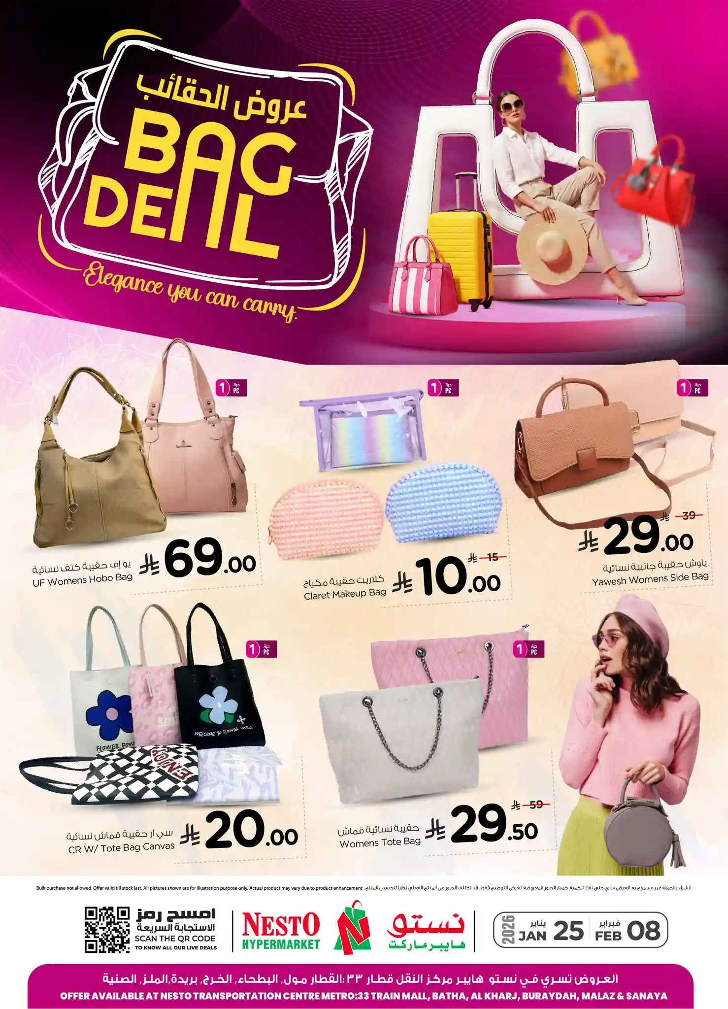 عروض نستو الرياض سارية من 25 يناير حتى 8 فبراير 2026 عروض الحقائب فى فروع نستو الرياض و نستو البطحاء و نستو العزيزية و نستو المدينة الصناعية و نستو الملز و نستو الرس و نستو شقراء و نستو المجمعة و نستو فيلاجيو مول و نستو بريدة
