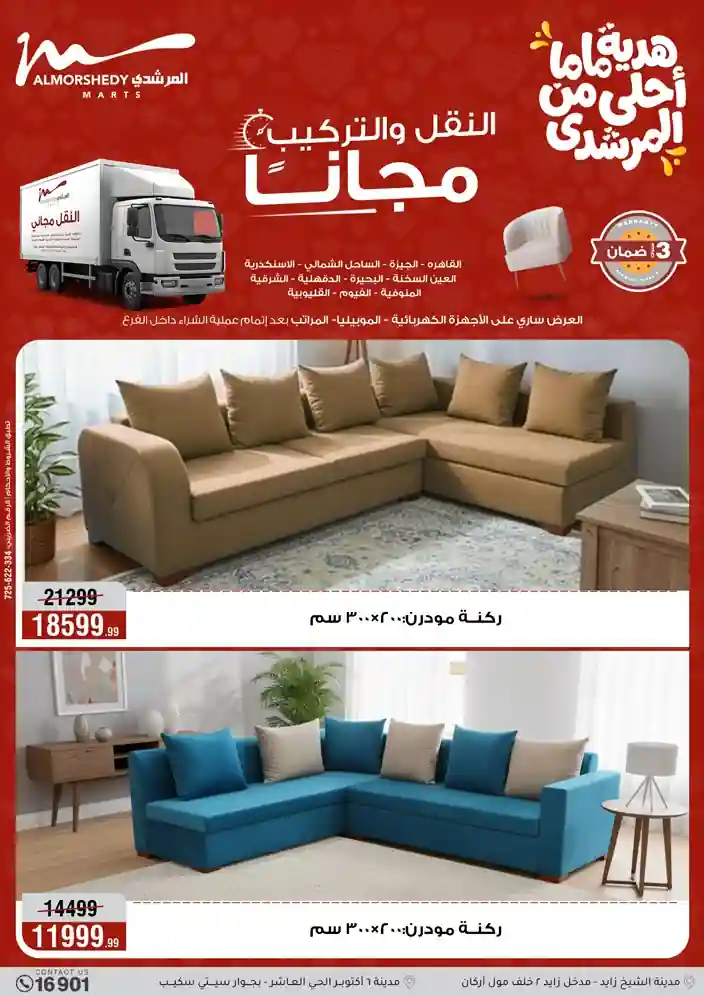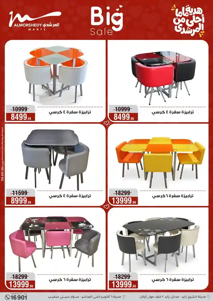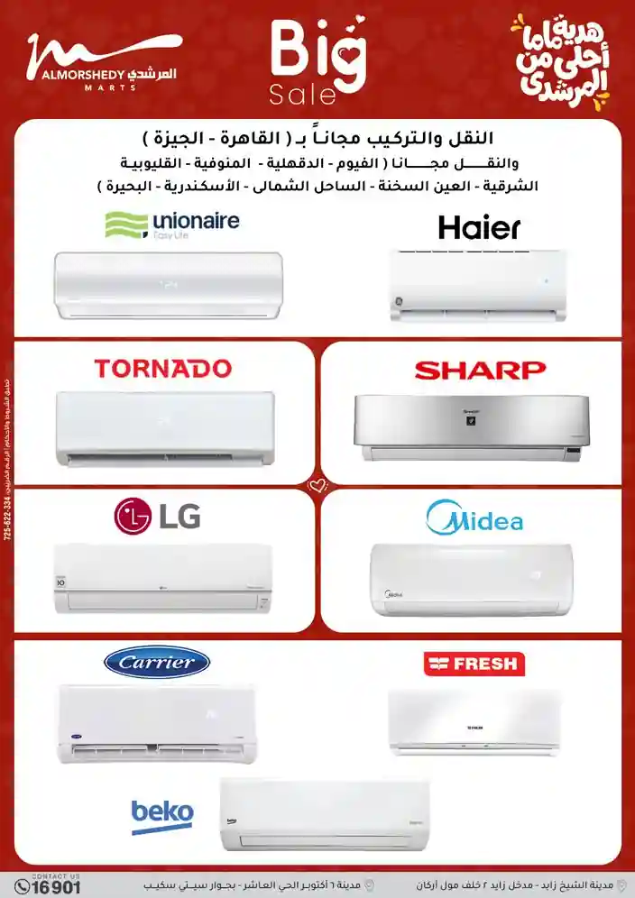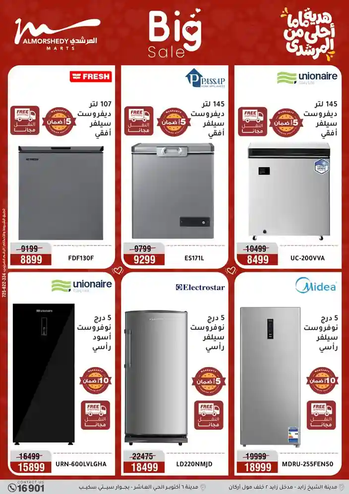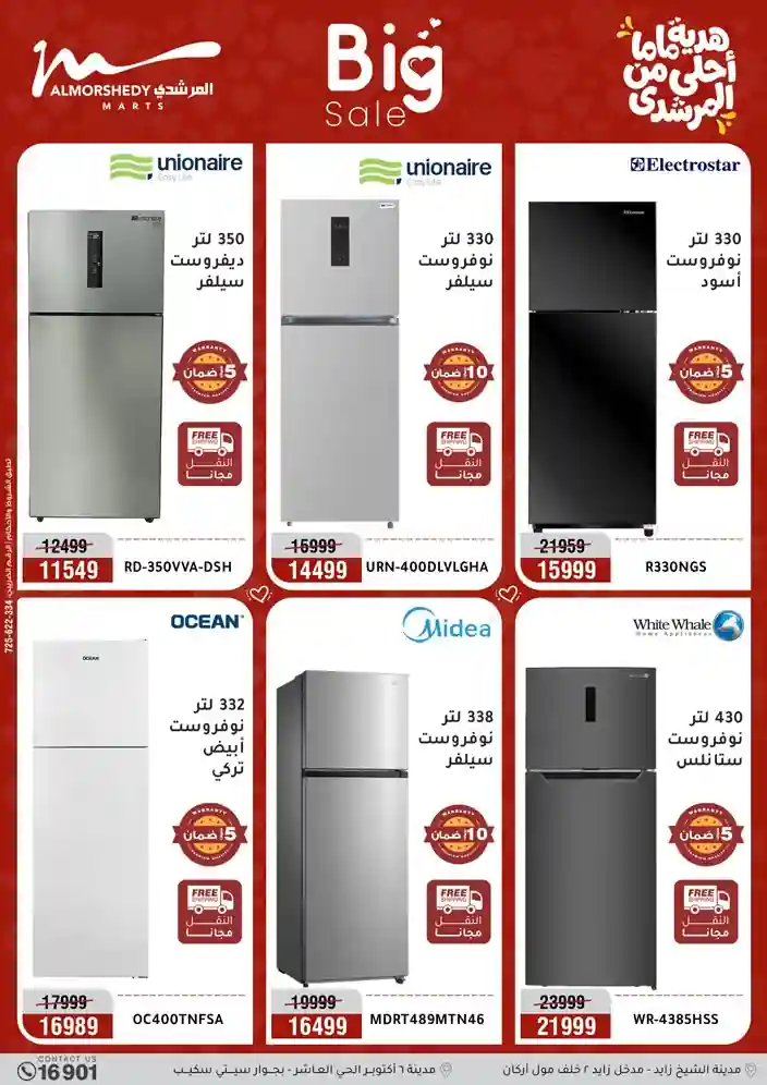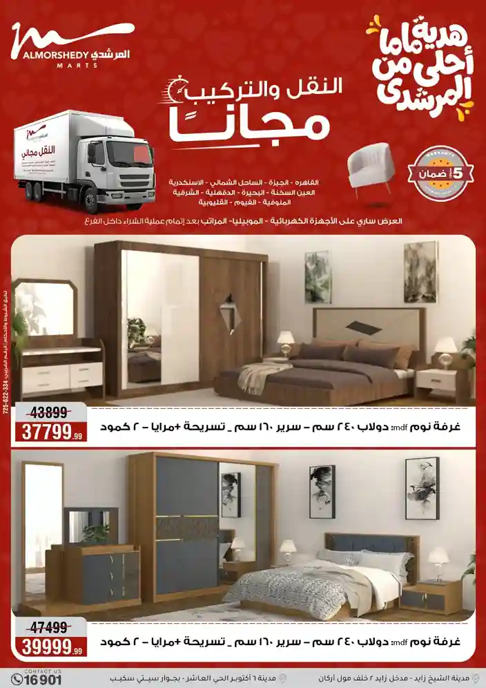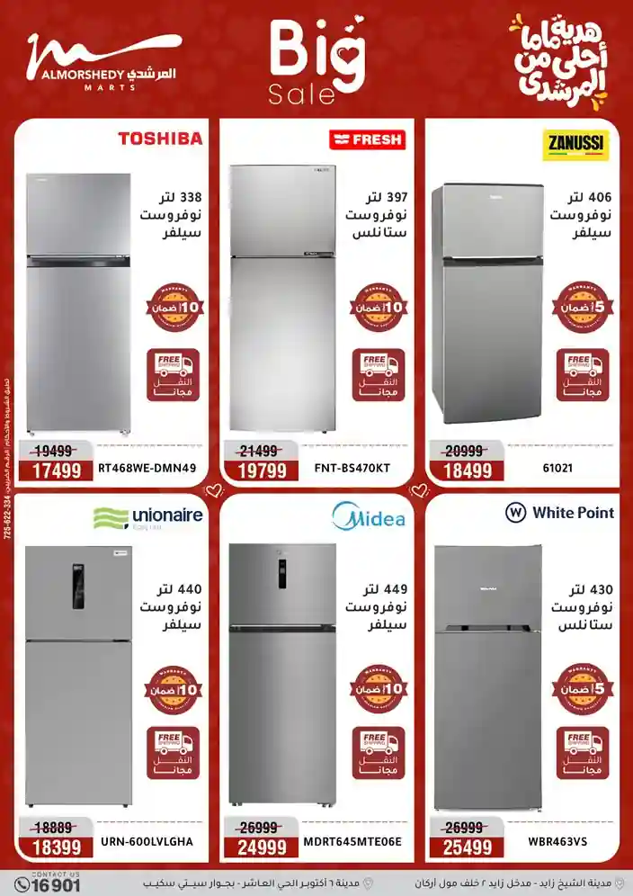 عروض جديدة من أسواق المرشدي مع اكبر مهرجان للتخفيضات في مصر خصومات حتى 70% وقسط براحتك بدون فوائد بأسعار العروض المخفضة على 12 شهر لحاملي بطاقة ائتمان CIB أو قسط براحتك مع VALU بدون مقدم حتى 60 شهر أو بدون مقدم وبدون فوائد مع نظام هاتريك وكمان النقل مجاني للقاهرة والجيزة والقليوبية على قسم الأجهزة الكهربائية والموبيليا والمراتب ( تطبق شروط المكان ) خصومات على جميع الأقسام أدوات منزلية – اجهزة كهربائية – مفروشات – موبيليا – نجف – سجاد – مراتب – ملابس رجالي وحريمي وأطفالي ومستلزمات ولعب الأطفال وجاليري وأقسام تانية كتير استمتع بالتسوق في أسواق المرشدي مع أكتر من 12 قسم و أكثر من 10,000 منتج يعني كل اللي بتحلم بيه عند المرشدي هتلاقيه