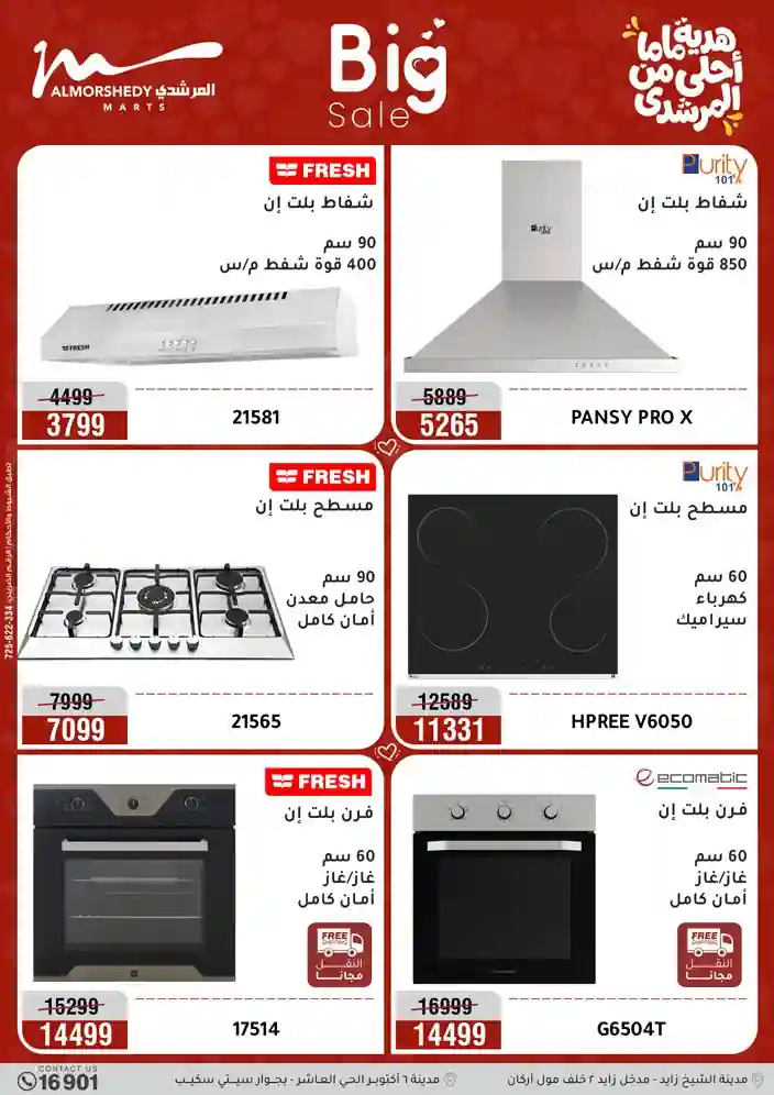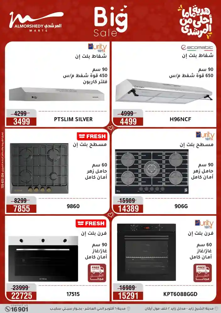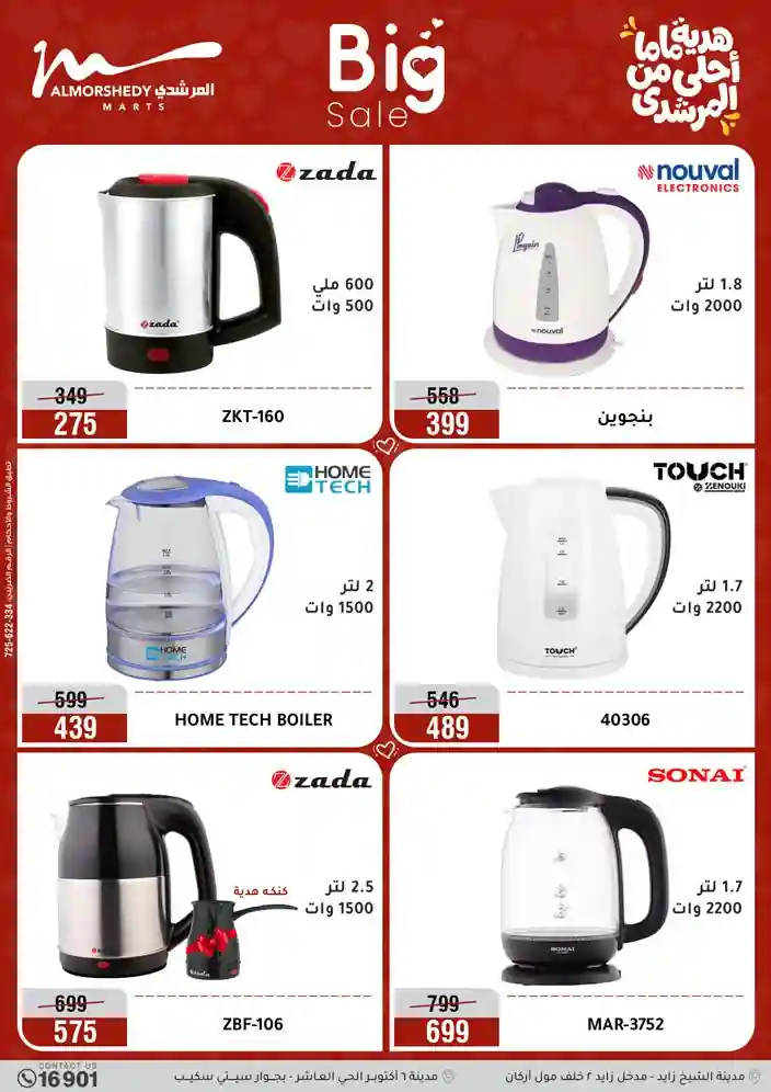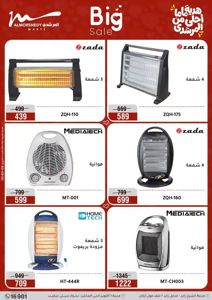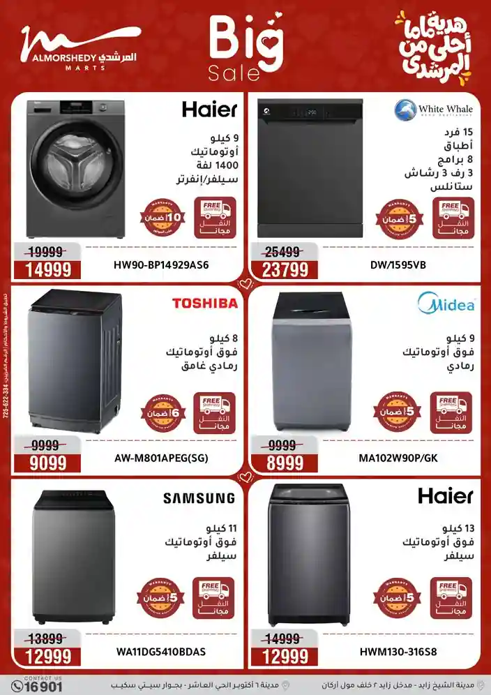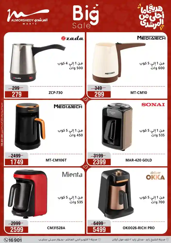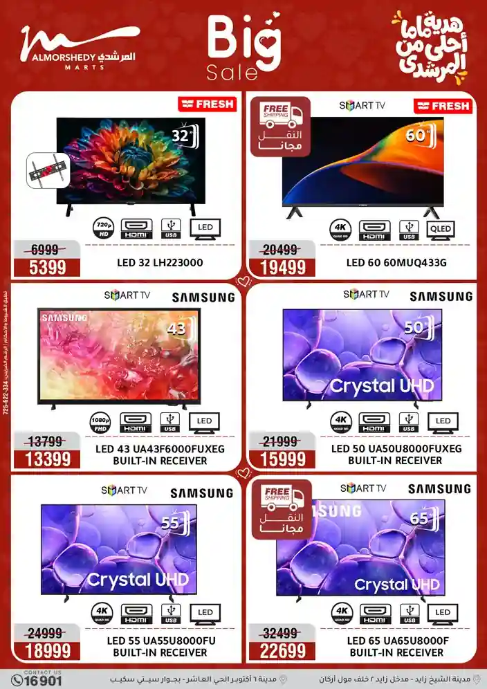 عروض جديدة من أسواق المرشدي مع اكبر مهرجان للتخفيضات في مصر خصومات حتى 70% وقسط براحتك بدون فوائد بأسعار العروض المخفضة على 12 شهر لحاملي بطاقة ائتمان CIB أو قسط براحتك مع VALU بدون مقدم حتى 60 شهر أو بدون مقدم وبدون فوائد مع نظام هاتريك وكمان النقل مجاني للقاهرة والجيزة والقليوبية على قسم الأجهزة الكهربائية والموبيليا والمراتب ( تطبق شروط المكان ) خصومات على جميع الأقسام أدوات منزلية – اجهزة كهربائية – مفروشات – موبيليا – نجف – سجاد – مراتب – ملابس رجالي وحريمي وأطفالي ومستلزمات ولعب الأطفال وجاليري وأقسام تانية كتير استمتع بالتسوق في أسواق المرشدي مع أكتر من 12 قسم و أكثر من 10,000 منتج يعني كل اللي بتحلم بيه عند المرشدي هتلاقيه