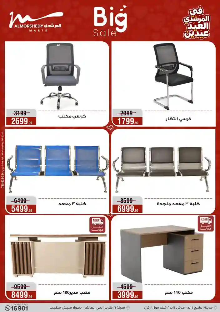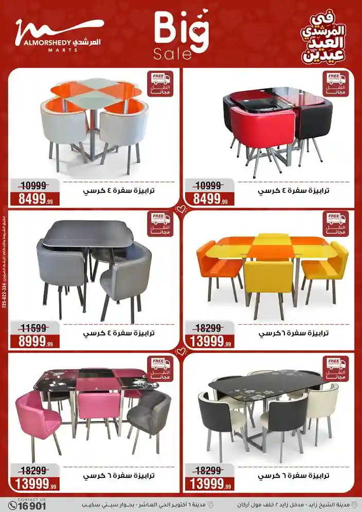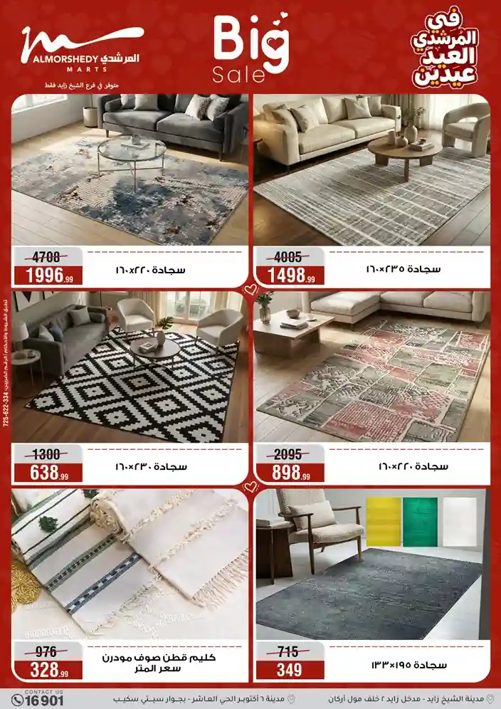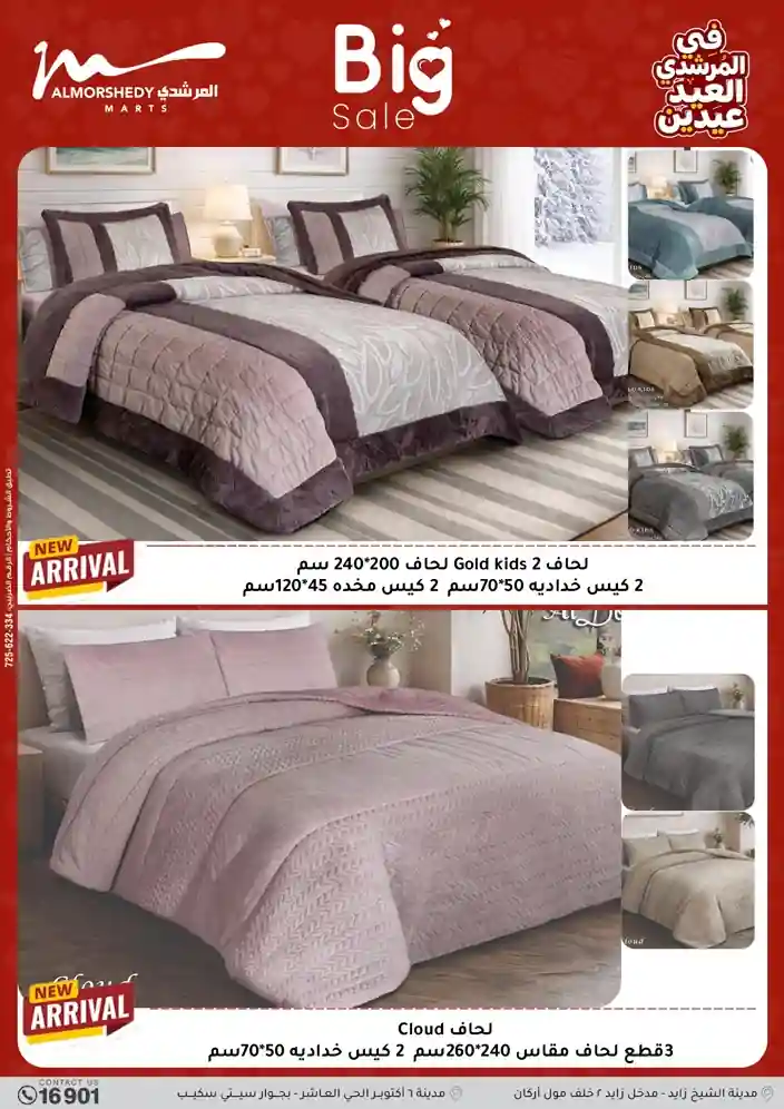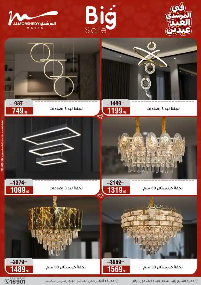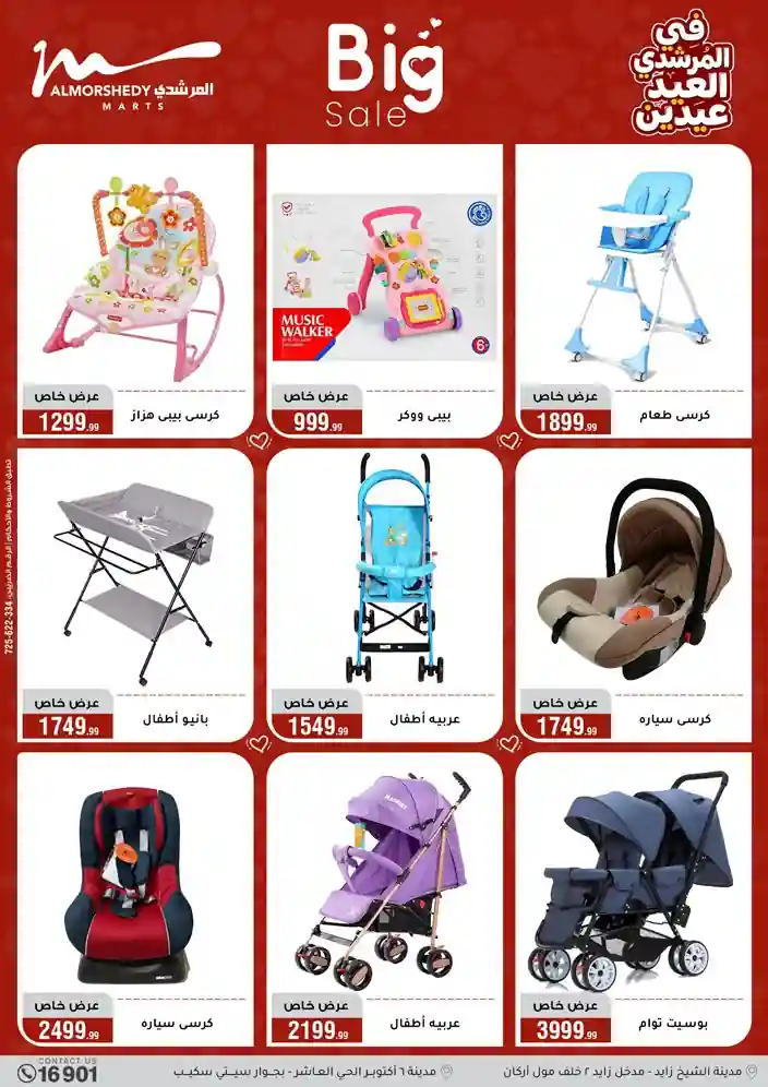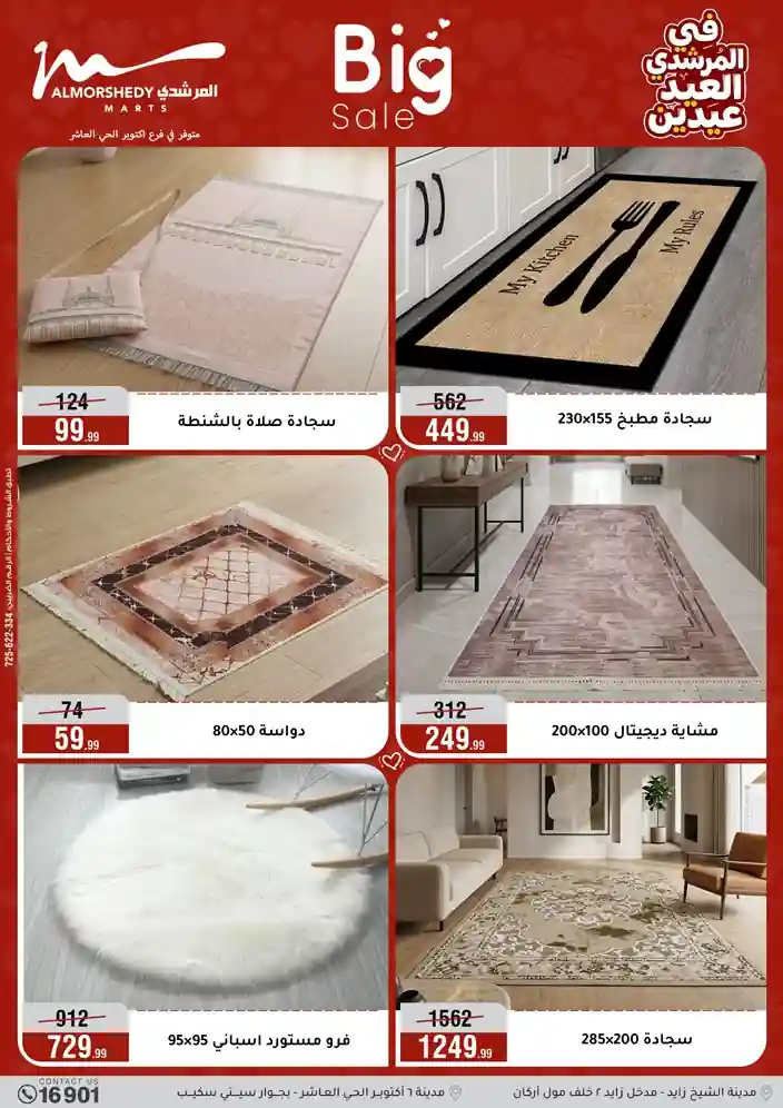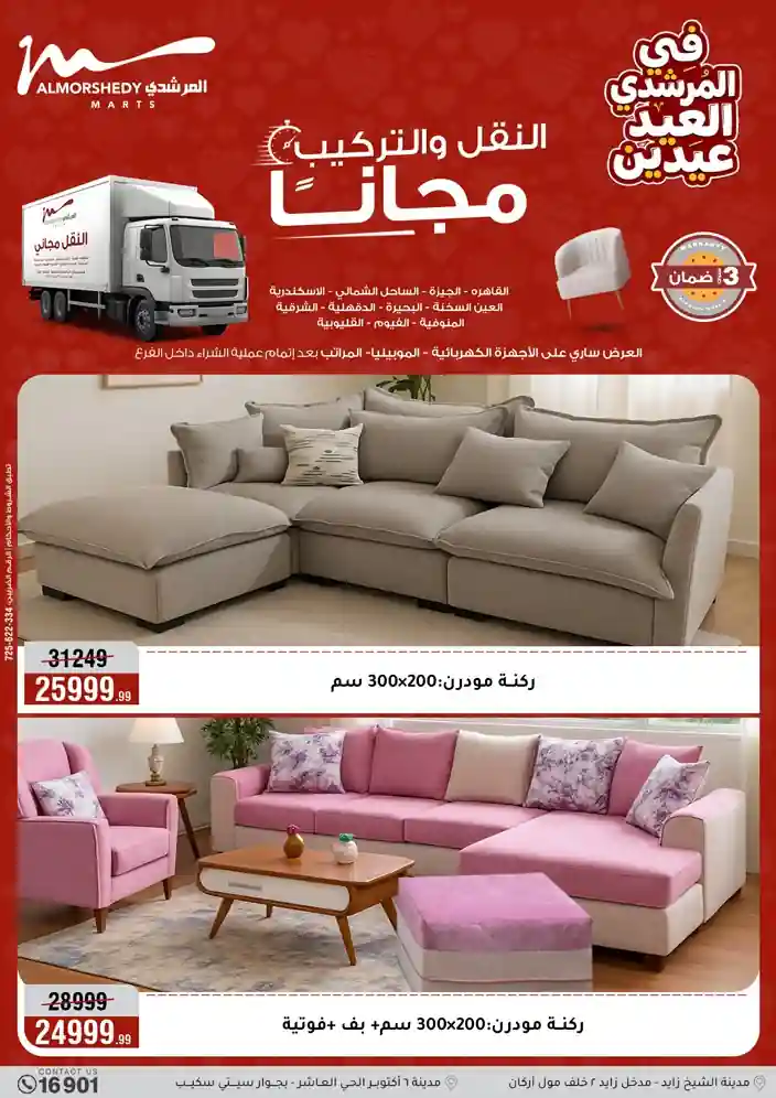 عروض جديدة من أسواق المرشدي مع اكبر مهرجان للتخفيضات في مصر خصومات حتى 70% وقسط براحتك بدون فوائد بأسعار العروض المخفضة على 12 شهر لحاملي بطاقة ائتمان CIB أو قسط براحتك مع VALU بدون مقدم حتى 60 شهر أو بدون مقدم وبدون فوائد مع نظام هاتريك وكمان النقل مجاني للقاهرة والجيزة والقليوبية على قسم الأجهزة الكهربائية والموبيليا والمراتب ( تطبق شروط المكان ) خصومات على جميع الأقسام أدوات منزلية – اجهزة كهربائية – مفروشات – موبيليا – نجف – سجاد – مراتب – ملابس رجالي وحريمي وأطفالي ومستلزمات ولعب الأطفال وجاليري وأقسام تانية كتير استمتع بالتسوق في أسواق المرشدي مع أكتر من 12 قسم و أكثر من 10,000 منتج يعني كل اللي بتحلم بيه عند المرشدي هتلاقيه